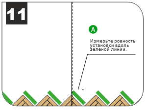 Проверьте ровность зеленой линии (см. рисунок). На протяжении всего монтажа повторяйте измерения с помощью линейки, отбивочной линии. При возникновении отклонений устраните их (см. схемы ниже).